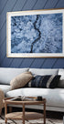 Et dramatisk vinterlandskap sett fra luften: en frossen elv slynger seg gjennom snødekte marker og skog, der rim mønstrer overflater i blå og hvite toner. Den prisbelønte fotografen Daniel Gastager fanger stille nordisk ro, grafiske linjer og kjølig klarhet – et blikk som gjør rommet ditt friskere. Hver dag.