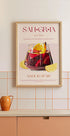 En livlig vintageinspirert plakat av Sangria, den klassiske spanske punchen laget med rødvin og fersk frukt. Med dristig typografi, sitrusdetaljer og et glass fylt av farger, fremkaller kunstverket iberisk sjarm og tidløs barkultur—perfekt for kjøkken, spisestuer eller cocktail-elskere.