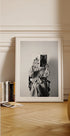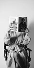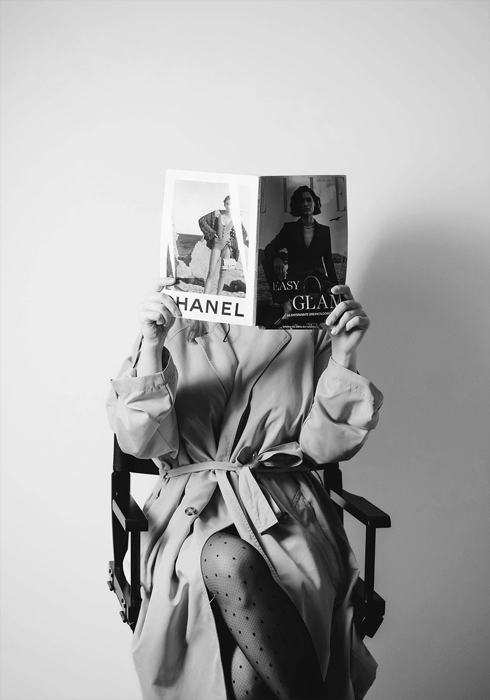 Et sofistikert svart-hvitt fotografi av en kvinne i trenchcoat og prikkete strømpebukser, som holder opp motemagasiner med Chanel og Elle. Kunstverket uttrykker tidløs stil og parisisk eleganse, perfekt som et statement i moderne, motebevisste interiører.