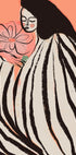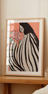 En drømmende og poetisk plakat med et stilisert portrett av en kvinne innhyllet i dristige svart-hvite striper, som forsiktig holder en blomsterkvast. Med sin myke ferskenfargede bakgrunn og uttrykksfulle linjer kombinerer kunstverket romantikk, femininitet og moderne illustrasjon i et dekorativt uttrykk fullt av følelser og sjarm.