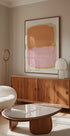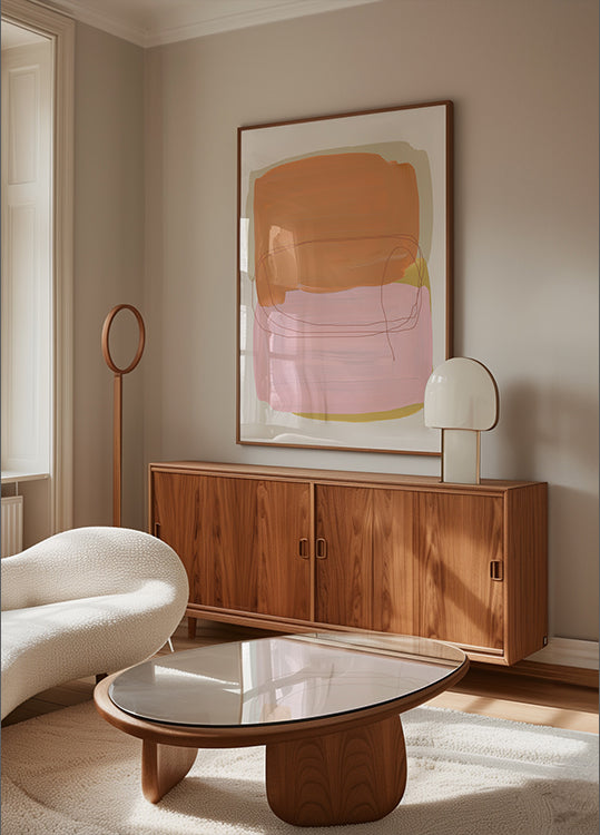 En myk og moderne abstrakt plakat med maleriske penselstrøk i fersken, rosa og subtile gylne toner. De overlappende teksturene og de myke linjene skaper en harmonisk balanse av varme og ro—perfekt for minimalistiske interiører, skandinavisk dekor eller moderne gallerivegger.