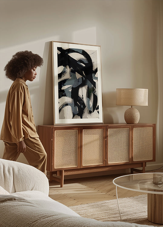 En slående abstrakt plakat med kraftige svarte penselstrøk lagdelt med myke beige og dempede grå detaljer. De feiende strøkene skaper dybde og rytme, og gir et dynamisk, men minimalistisk uttrykk—perfekt for skandinaviske interiører, moderne dekor eller samtids gallerivegger.