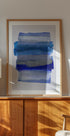 En beroligende abstrakt plakat med lagdelte horisontale penselstrøk i nyanser av blått og grått mot en ren hvit bakgrunn. Den maleriske teksturen og de myke overgangene gir en følelse av ro og dybde—perfekt for moderne interiører, skandinavisk dekor eller minimalistiske gallerivegger.