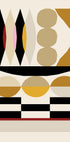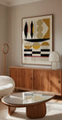 En dristig Bauhaus-inspirert abstrakt plakat med geometriske former i jordfarger som oker, beige og svart, aksentert med rødt og rosa. De rene, strukturerte formene skaper en slående visuell balanse som kombinerer moderne minimalisme med mid-century design—perfekt for moderne interiører eller retro-inspirerte gallerivegger.