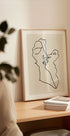 Abstract Faces Intertwined av Uma Gokhale er en elegant, minimalistisk line art-komposisjon der to ansikter smelter sammen i en intim, kyssende kontur. Sorte, flytende streker mot hvit bakgrunn gir et moderne og tidløst uttrykk som formidler nærhet, lidenskap og ro. Perfekt for moderne vegger og romantiske interiører.