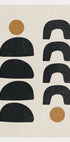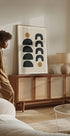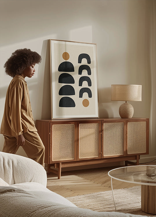 Denne moderne kunstplakaten viser et rytmisk mønster av svarte halvsirkler og hestesko-lignende buer, fremhevet av to jordnære okergule prikker. Den balanserte oppbyggingen og nøytrale paletten gjør den til et allsidig dekorvalg for moderne, bohemske og nordisk-inspirerte interiører. Perfekt alene som et statement eller sammen med andre abstrakte verk på en minimalistisk gallerivegg.