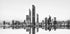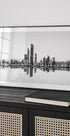 En slående byplakat i svart-hvitt av Abu Dhabi som fanger den moderne skyline speilet perfekt i det rolige vannet. Med elegante tårn, urbane lys og symmetrisk refleksjon fremhever kunstverket arkitektonisk eleganse og den levende ånden i UAE sin hovedstad.