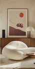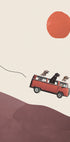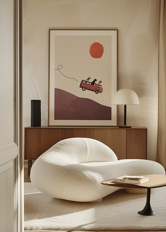 Eventyrlystne hunder cruiser i en vintage rød VW-buss over bølgende åser, badet i sol. Maarten Léons lekne collage blander retro road trip-stemning med mid-century uttrykk, humor og varme. Et sjarmerende blikk på frihet, vennskap og farten mot nye horisonter. Perfekt til barnerom, stue eller kontor for et løft av reiseglede.
