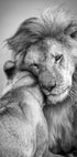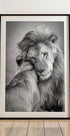 En gripende svart-hvitt dyrelivsplakat som viser en løve og en løvinne i en øm omfavnelse. Fanget i Tanzanias Serengeti, symboliserer dette kunstverket kjærlighet, styrke og hengivenhet i naturen. Perfekt for natur-, dyre- og romantiske interiører.