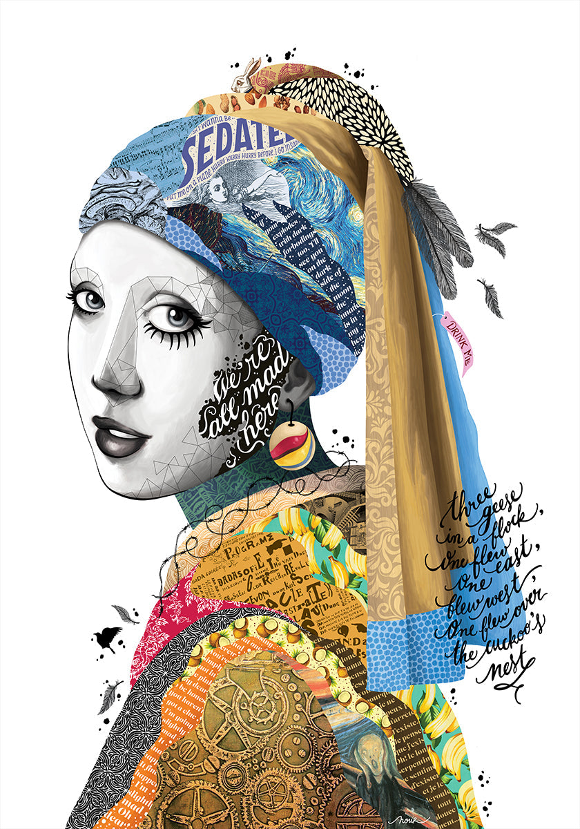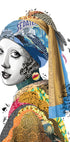 En livlig og eklektisk pop art-collage inspirert av Piken med perleøredobb. Kunstverket kombinerer klassisk portrettkunst med moderne typografi, surrealistiske teksturer og kulturelle referanser. Den lekne miksen av ord, mønstre og illustrasjoner skaper en slående og moderne nytolkning av et tidløst ikon.