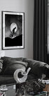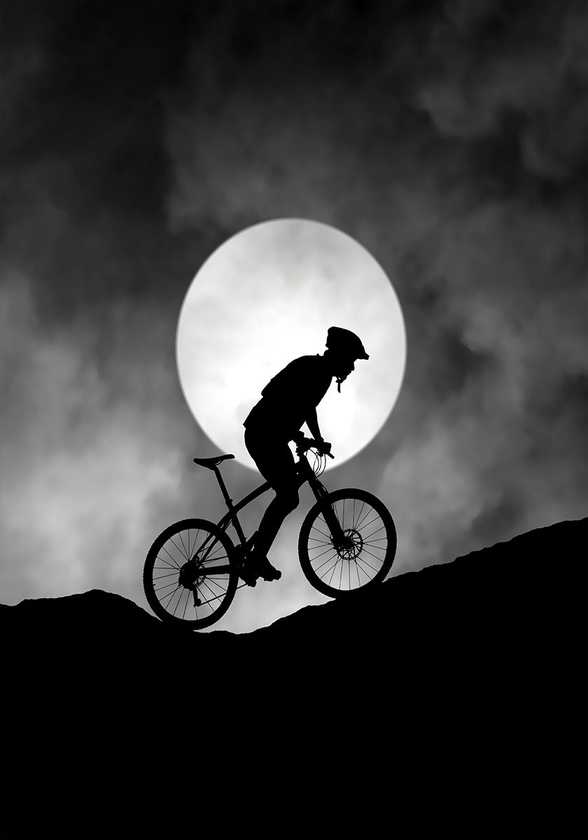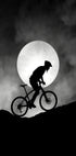 Et kraftfullt svart-hvitt silhuettbilde av en syklist som klatrer oppover under en glødende fullmåne. Den dramatiske kontrasten mellom lys og skygge skaper en surrealistisk og eventyrlig stemning, som fanger spenningen ved nattridning, besluttsomhet og utholdenhet i naturens kulisser.