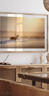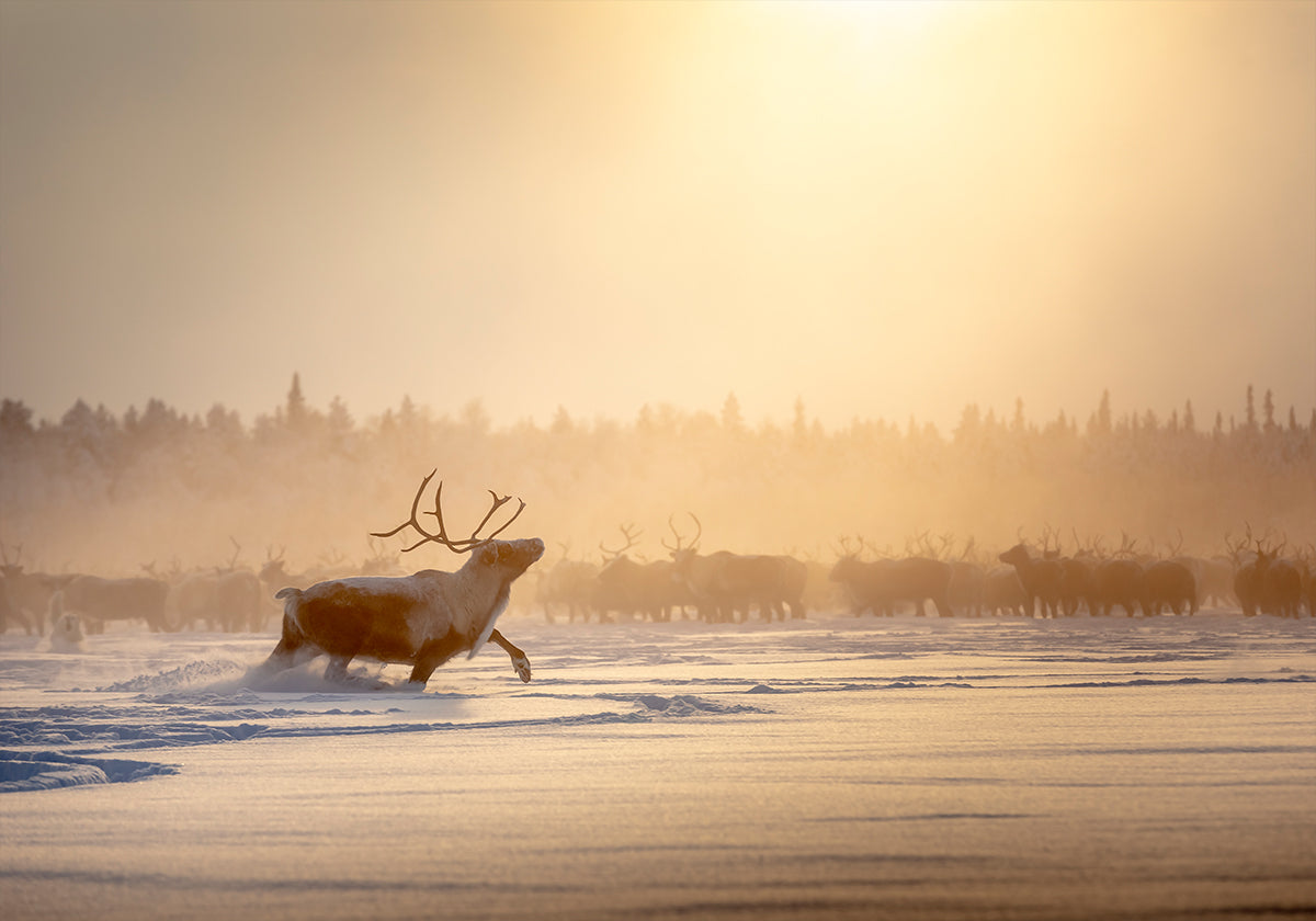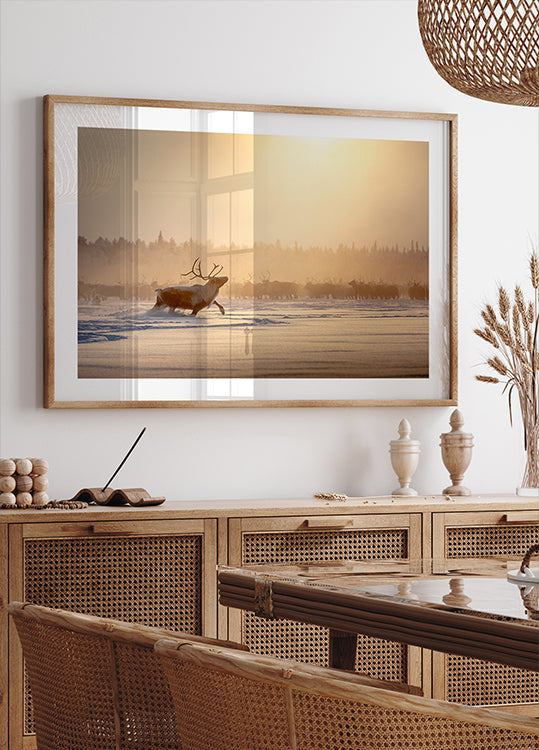 Alpha male av Patrik Minar skildrer en majestetisk reinsbukk som trer frem fra vinterens stillhet. Snøfnugg danser i luften, mens gyldent lys fanger det kraftige geviret og den årvåkne profilen. Et stemningsfullt blikkfang som bringer nordisk ro, styrke og vintermagi inn i hjemmet. Perfekt til stue, hytte eller kontor.