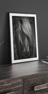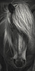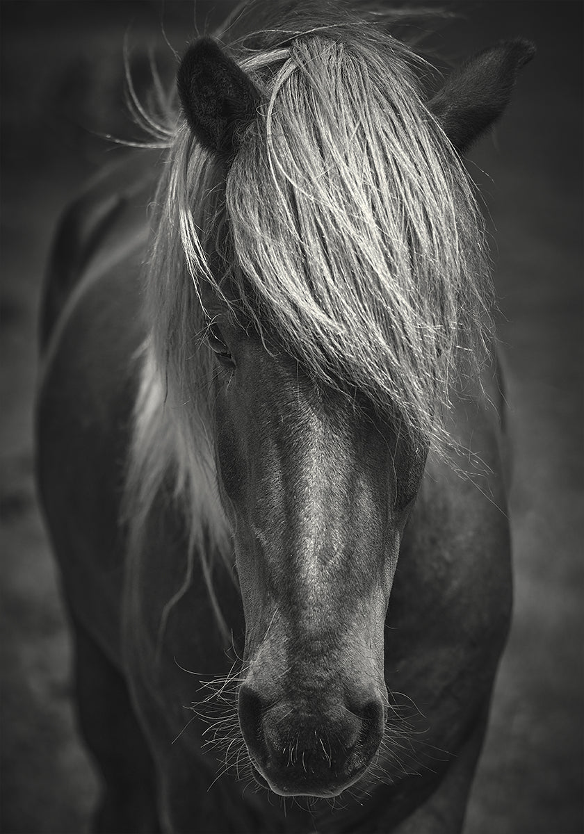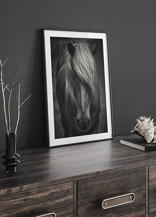 Et slående svart-hvitt portrett av en islandshest, med manen fallende fremover i en stilig, vindblåst look. De monokrome tonene fremhever hårets rå tekstur og dyrets rolige styrke, og skaper et modig, men samtidig intimt dyreportrett. Perfekt for naturelskere og minimalistiske interiører.