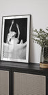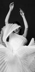 Et slående svart-hvitt portrett av en kvinne i en skulpturell plissékjole, fanget midt i bevegelse. De dramatiske foldene og det flytende stoffet skaper en følelse av rytme og eleganse, som minner både om dans og abstrakt skulptur. Et modig monokromt kunstverk som blander mote, bevegelse og kunst.