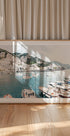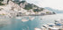 Et betagende fotografi av Amalfikysten, der pastellfargede hus stiger opp over klippene og båter flyter fredelig i det turkise vannet. Scenen fanger essensen av italiensk sommer – en harmonisk blanding av kystsjarm, arkitektur og middelhavets ro.