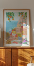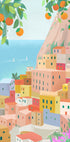 En livlig illustrasjon av Amalfikysten, der pastellfargede hus stuper nedover klippene mot det turkise havet. Omgitt av appelsintrær og blomster fanger kunstverket essensen av italiensk sommer – solfylt arkitektur, middelhavssjarm og gleden ved reiser og ferie.