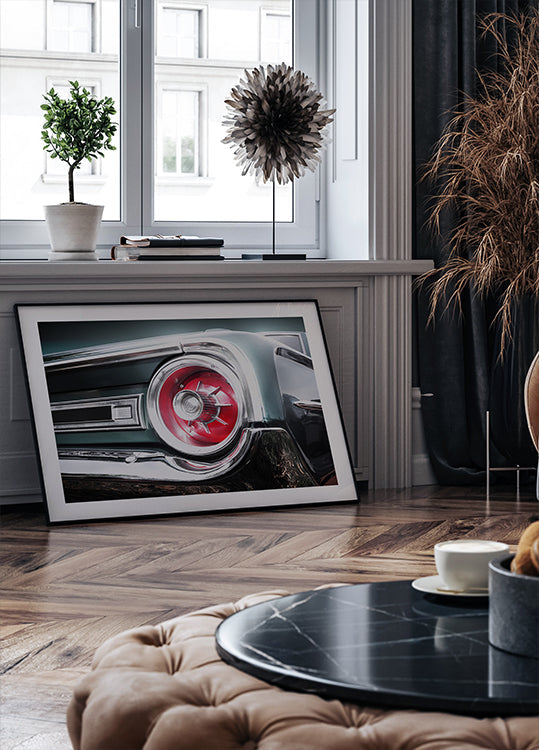 Et detaljert nærbilde av baklykten på den legendariske 1964 Ford Galaxie 500, et ikon innen amerikansk bildesign. Kunstverket fremhever kromdetaljene, de elegante linjene og den karakteristiske røde baklykten som definerte veicruiserne på 1960-tallet. Et perfekt nostalgisk stykke for elskere av klassiske amerikanske biler.