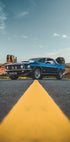 En klassisk blå Ford Mustang parkert stolt på den ikoniske Route 66, omgitt av uendelig ørkenhimmel og høye steinformasjoner. Dette kraftfulle bildet fanger ånden av frihet, nostalgi og amerikansk roadtrip-kultur – en tidløs feiring av muskelbiler, åpne motorveier og eventyr.