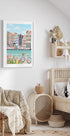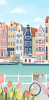 En fargerik og sjarmerende illustrasjon av Amsterdam by med sine ikoniske kanalhus, sykler, tulipaner og båter. Kunstverket fanger essensen av nederlandsk kultur, med livlige fasader, rolige kanaler og en romantisk byatmosfære. Perfekt for reiseelskere og de som inspireres av europeisk sjarm.
