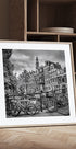 En stemningsfull svart-hvitt-plakat av Amsterdam, fotografert av Melanie Viola: sykler lenet mot rekkverket på Rosa Overbeekbrug ved blomstrende kanaler, omgitt av smale historiske hus. Dramatiske skyer speiler seg i vannet og fremhever byens tidløse eleganse og urbane ro. Et ikonisk blikk på Jordaan og byens sykkelkjærlighet.