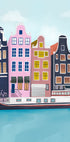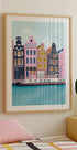 Drømmende Amsterdam-scene av Petra Lizde: smale kanaler og ikoniske gavlhus speiler seg i stille vann, mens en liten båt glir forbi under rosa kveldshimmel. Grafisk, malerisk og moderne – en hyllest til byens rytme, med urbane detaljer, myke pasteller og reiselyst som fanger både nostalgi og eventyr.