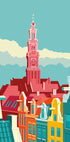 Opplev ikoniske Westerkerk i hjertet av Jordaan, tolket av den nederlandske illustratøren Remko Heemskerk. Plakaten fanger byens klassiske taklandskap, smale kanalhus og den slanke kirketårn-silhuetten mot en rolig himmel – en stilsikker hyllest til Amsterdam og dens tidløse arkitektur. Perfekt for deg som elsker byliv og europeisk estetikk.