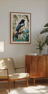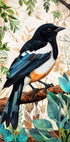 Et fantastisk akvarellinspirert kunstverk av en skjære som sitter på en gren, omgitt av livlige blader og planter. Denne detaljerte fugleillustrasjonen fanger naturens skjønnhet med fuglens glansfulle fjær og elegante holdning. Perfekt for dyrelivsentusiaster, botanikunstelskere eller som dekorasjon i stue, soverom og gallerivegger.