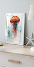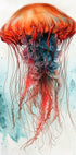 En fantastisk akvarellillustrasjon av en manet, med ildoransje klokke og lange tråder som svever grasiøst i blåtoner. Dette marine kunstverket fanger undervannslivets eleganse med maleriske detaljer, og kombinerer kunst og natur til en fengslende akvatisk scene.