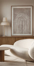 En minimalistisk abstrakt plakat med håndtegnede buelinjer i klar hvit på en myk beige teksturert bakgrunn. Den organiske geometrien og nøytrale fargetoner skaper en beroligende balanse, ideell for Japandi, skandinaviske eller moderne minimalistiske interiører.