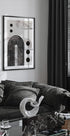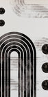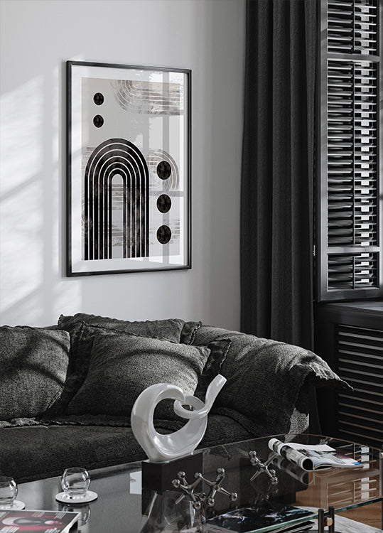 En slående abstrakt plakat med kraftige svarte buer, sirkulære former og lagdelte geometriske linjer på en lys teksturert bakgrunn. Den monokrome paletten fremhever symmetri og balanse, og gjør den til et elegant blikkfang i moderne, Japandi- eller skandinavisk-inspirerte interiører.