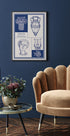 En vakkert detaljert illustrasjon i vintage-stil som hyller gresk kulturarv, med klassiske elementer som en jonisk søyle, en amphora, en marmorbyste, en lyre og olivengrener. Den dype blå-hvite designen reflekterer tradisjonell gresk estetikk, perfekt for historieelskere og reisende.