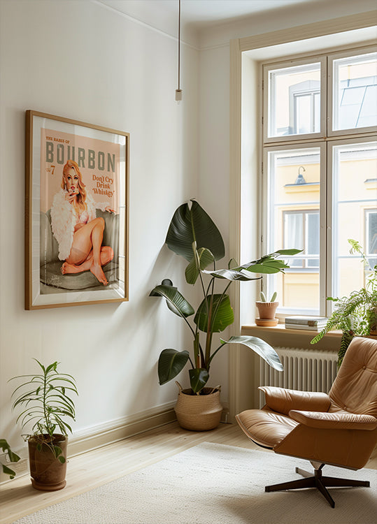 En sensuell pinup med retro eleganse løfter glasset i en bourbon-dunkel bar, omgitt av flasker, glødende neonlys og røykfylt stemning. Klassisk styling, røde lepper og silhuett i undertøy gir tidløs glamour. Perfekt blikkfang til bar, man cave eller stue med forkjærlighet for whiskey og vintage. Detaljene oser av natteliv og nostalgi.