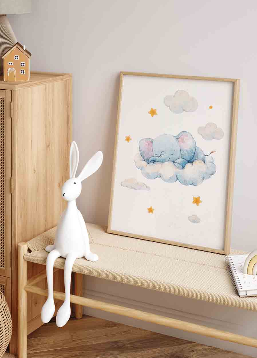 En herlig akvarellillustrasjon av en baby-elefant som sover fredelig på en myk sky. Scenen er dekorert med flytende stjerner og myke skyer, som skaper en drømmende og rolig atmosfære. Myke pastellfarger i blått og gult forsterker den beroligende stemningen, perfekt for barnerom og soverom, og gir en følelse av varme, fred og undring.