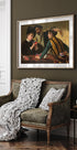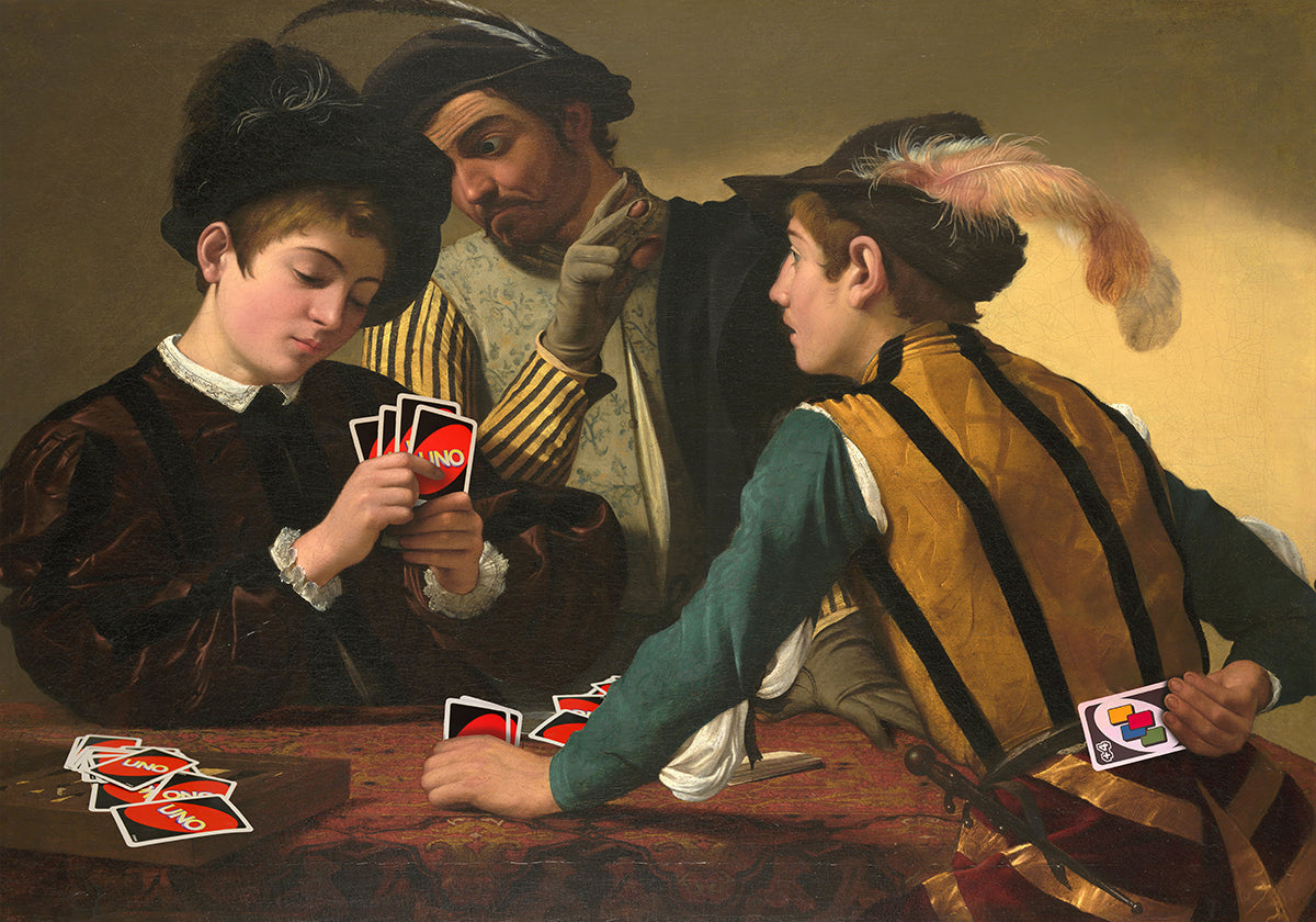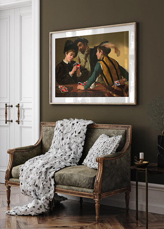En barokk gentleman med hatt sitter ved et bord, badet i dramatisk lys à la Caravaggio, mens han triumferer i et surrealistisk kortspill — fra poker til UNO. En lekent nostalgisk collage som blander museumskunst med popkultur, humor og vintage-vibber. Perfekt samtalestarter til hjem og kontor. Skapt av Dikhotomy som en humoristisk mash-up.