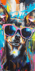 Et livlig popkunstportrett i gatekunststil av en Chihuahua med fargerike solbriller, malt med dristige graffiti-inspirerte strøk. Dette lekne og moderne kunstverket kombinerer humor, stil og urban energi, og gir en morsom og edgy stemning til ethvert rom.