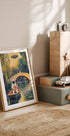 Et surrealistisk maleri i impresjonistisk stil av astronauter i et jordnært landskap. En astronaut sitter i en båt og spiller gitar, mens en annen gestikulerer fra en steinbro under en gyllen himmel. Over dem svever et UFO, som kombinerer science fiction med kunsthistorie i en humoristisk og fantasifull scene.