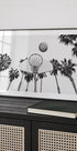Et slående svart-hvitt fotografi som fanger en basketball i luften på vei mot kurven, innrammet av høye palmer under en klar himmel. Bildet kombinerer energien fra urbane sporter med den avslappede kystfølelsen fra California, og er et perfekt kunstverk for moderne interiører.