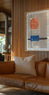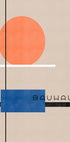 En minimalistisk Bauhaus-inspirert plakat med dristige geometriske former, inkludert en stor oransje sirkel og en markant blå rektangel på en beige bakgrunn. Rene linjer og enkle kontraster gjør dette kunstverket til et tidløst innslag i både moderne og vintage interiør.