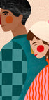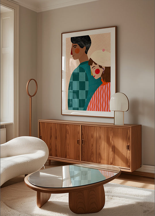 En varm og moderne illustrasjonsplakat av et par, der den ene lener seg mykt mot den andres skulder. De sterke fargene, lekne teksturene og de stiliserte formene uttrykker ømhet, trygghet og intimitet – et oppløftende verk for moderne og koselige hjem.