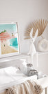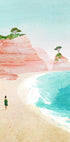 En rolig kystillustrasjon med en ensom skikkelse som vandrer langs en sandstrand med turkise bølger og røde klipper i bakgrunnen. Inspirert av Algarvekysten i Portugal, fanger dette kunstverket roen og harmonien fra sommeren ved havet.