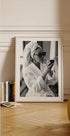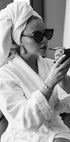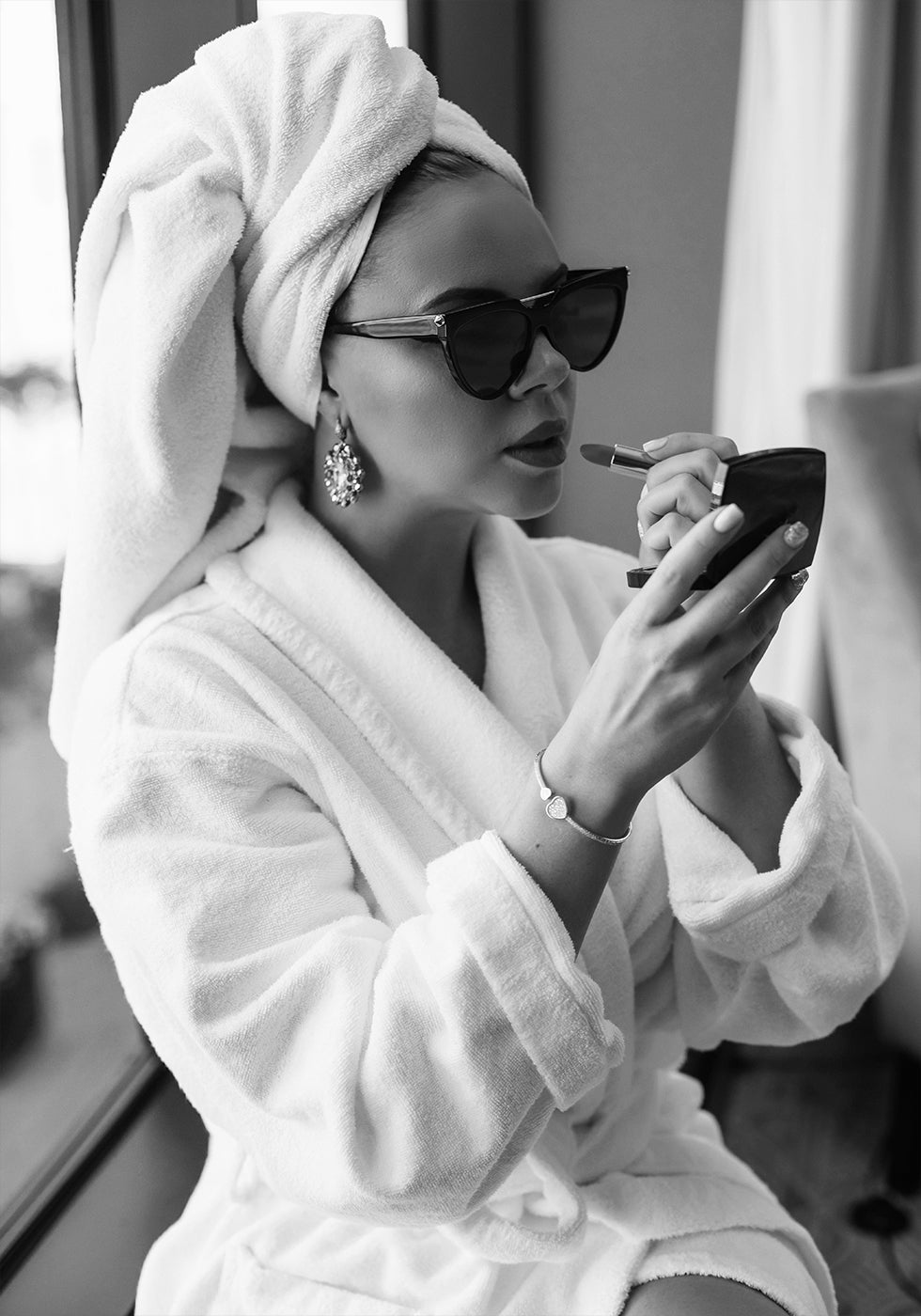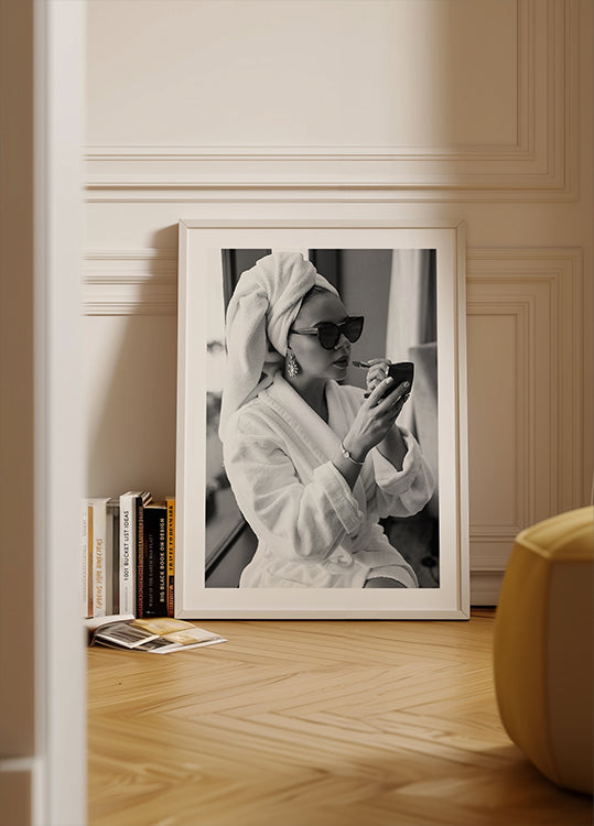Et sofistikert svart-hvitt fotografi av en kvinne i badekåpe med håndkle rundt hodet, som legger leppestift iført solbriller og statement-smykker. Dette elegante kunstverket hyller skjønnheten i små ritualer og tidløs glamour, perfekt for motebevisste interiører.