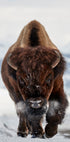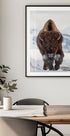 Et kraftfullt naturfotografi av en bison som stormer frem gjennom snøen. Med frostrøyk og snø i ansiktet fanger dette dramatiske bildet den rå styrken, utholdenheten og den mektige tilstedeværelsen til et av Nord-Amerikas mest ikoniske dyr.