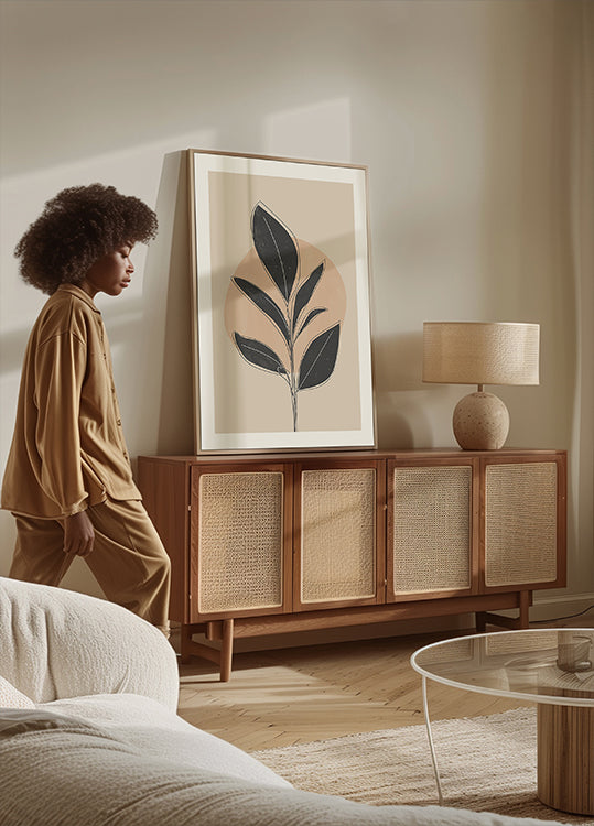 Black Abstract Plant forener botaniske former og geometrisk ro i et grafisk uttrykk. En stilisert, svart plante reiser seg mot varme, beige toner og skaper et sofistikert blikkfang. Minimalistisk og skandinavisk i følelsen – perfekt alene eller som del av en trio for å gi rommet organisk balanse. Henger vakkert i stue, soverom og gang.