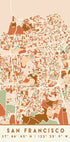 En mørk, stemningsfull plakat av Emiliano Deificus: en elegant kartvisjon av San Francisco der jordtoner, sorte konturer og grafiske lag danner byens åser, gater og havnebukt. Urban geometri møter organisk topografi og gir et rolig, tidløst uttrykk som passer perfekt i moderne, minimalistiske interiører.