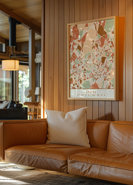 Black Maps Earth Tones 79 av Emiliano Deificus er et stilisert kart over Seoul i dype jordtoner og sort. Intrikate gater og Han-elven tegner et detaljert bybilde som balanserer presisjon og poesi. Et moderne, grafisk blikk på Sør-Koreas metropol – perfekt for å fremheve reiselyst, design og urban ro.