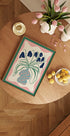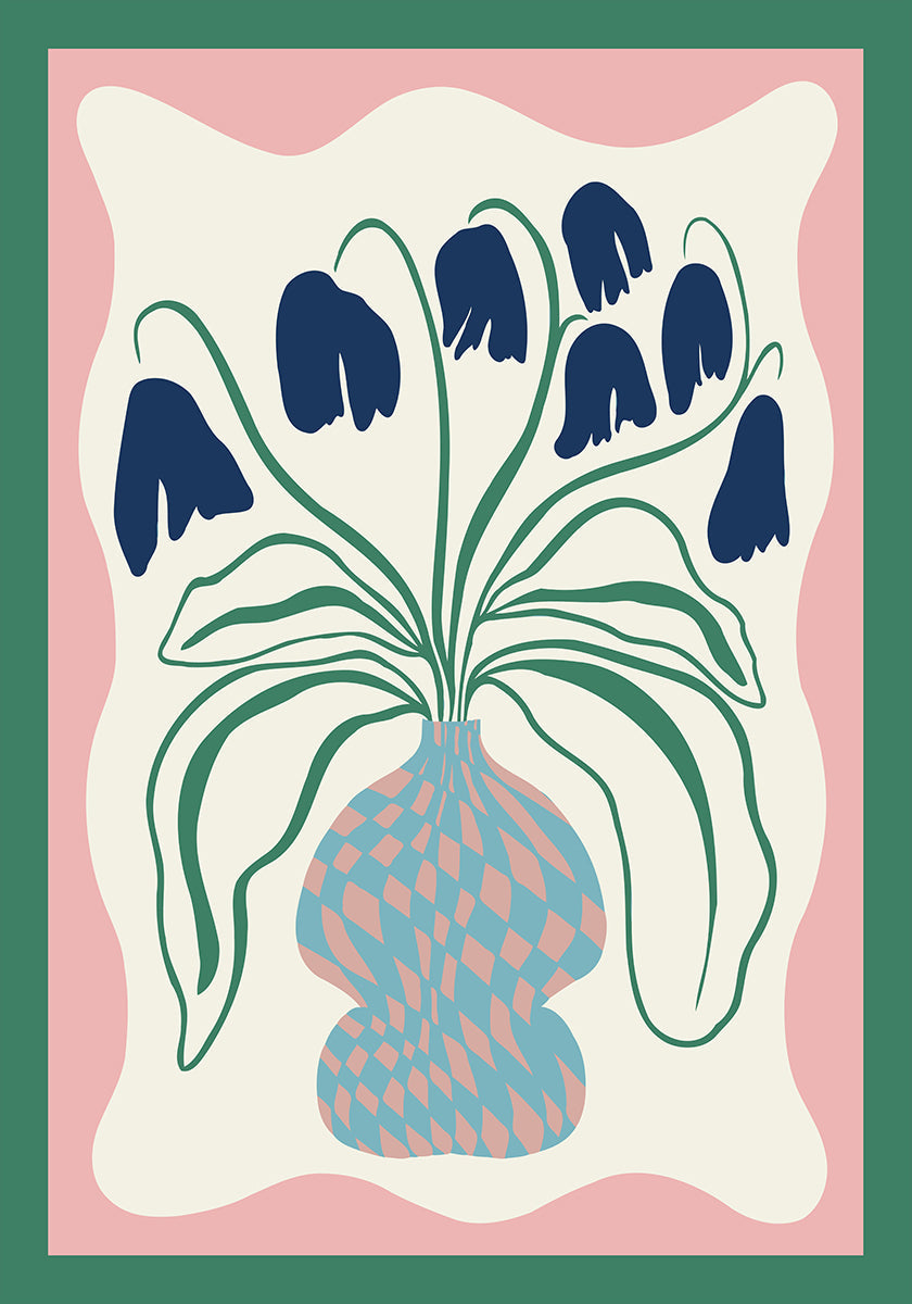 Blessing av Miho Art Studio er en retro-inspirert, Matisse-aktig stillebenplakat med dristige, grafiske former: en terrakottavase fylt med frodige, oransje blomster og botaniske blader. Varme 70-tallsfarger og minimalistiske linjer skaper en glad, rolig atmosfære som løfter både stue og arbeidsplass.