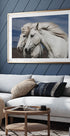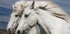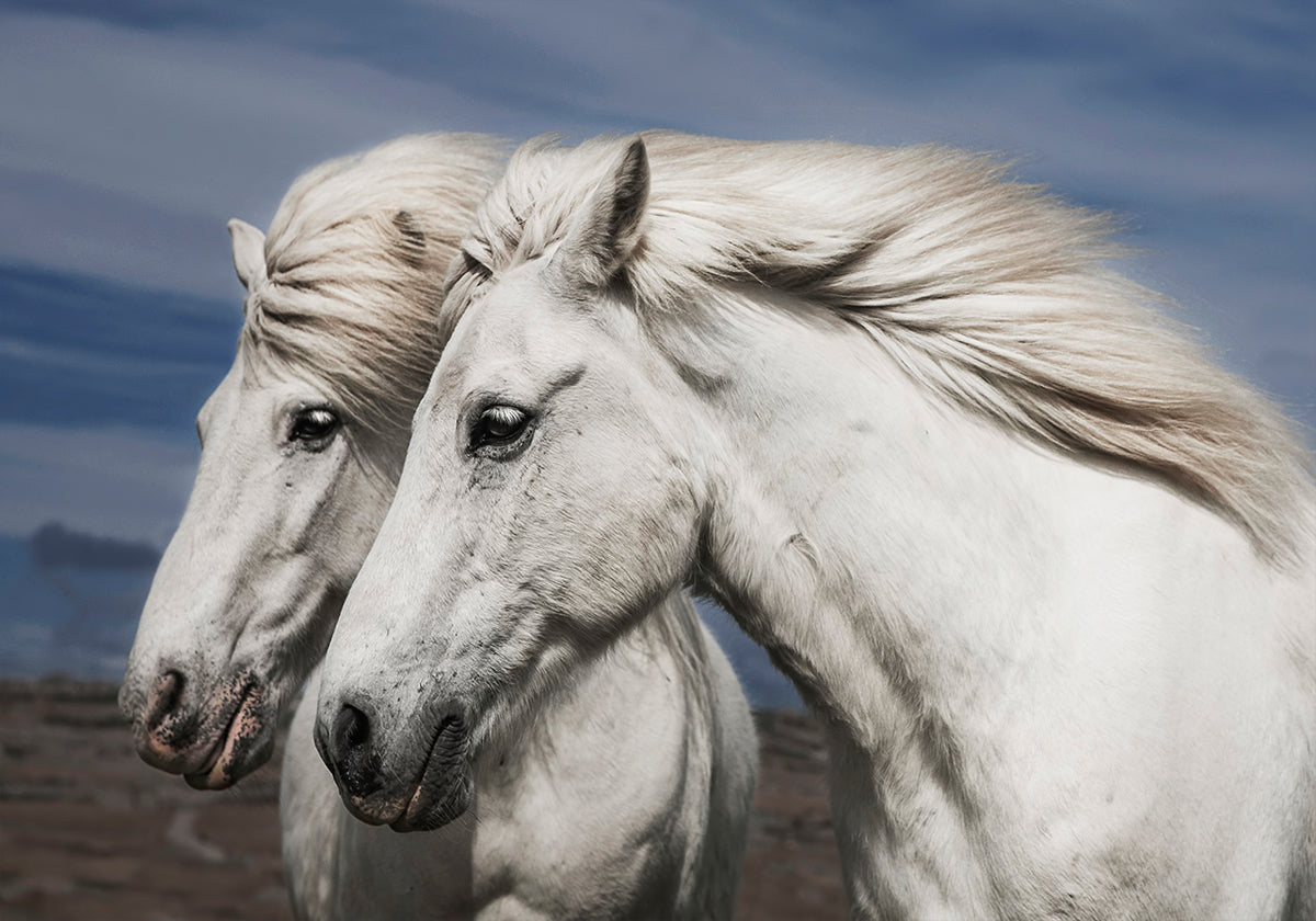 Et fantastisk fotografi av to hvite hester med manene flagrende i vinden, som symboliserer frihet, ømhet og vennskap. Deres grasiøse nærvær mot det naturlige landskapet fanger essensen av romantikk og vennskap.