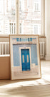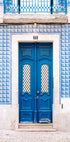 Et livlig fotografi av en tradisjonell portugisisk inngang i Lisboa, med iøynefallende blå fliser og en markant tredør. Kunstverket fanger sjarmen i europeiske bymiljøer og fremhever elegansen i arkitektoniske detaljer og urban kulturarv.