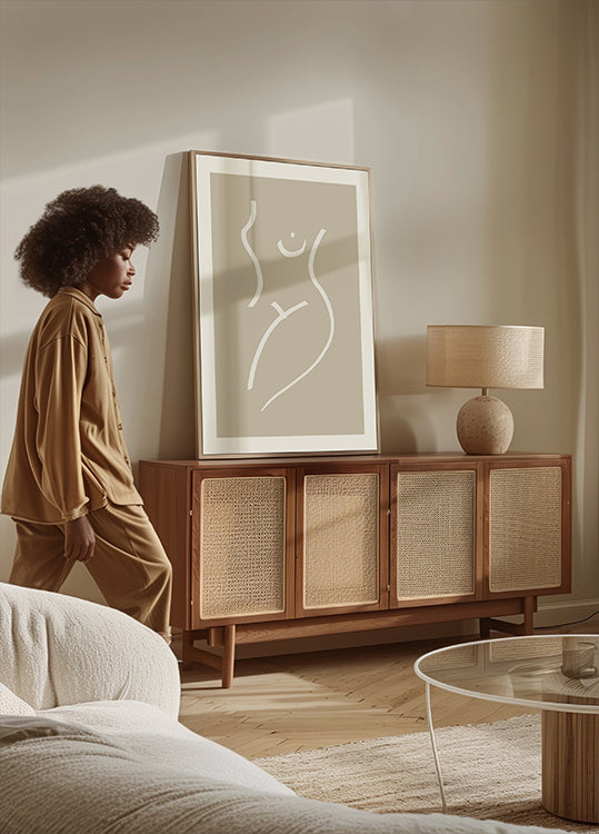 En elegant, minimalistisk konturtegning av den kvinnelige kroppen i varme sand- og beige toner. Myke linjer, romslig negativt rom og dempede skygger gir et rolig, moderne uttrykk. Subtil, men uttrykksfull komposisjon av Pictufy Studio som fremhever balanse, poise og tidløs estetikk. Perfekt som rolig blikkfang i stue, soverom eller hjemmekontor.