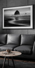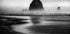 Et dramatisk svart-hvitt fotografi av Cannon Beach i Oregon, med den ikoniske Haystack Rock som reiser seg fra det tåkete havet. Monokrome toner fremhever teksturene i sand, bølger og stein, og skaper en atmosfære av mysterium og tidløs skjønnhet i dette kystlandskapet.